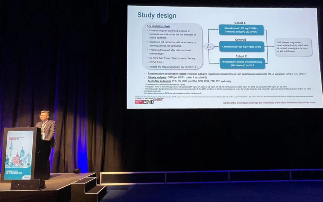 有望为宫颈癌患者带来治疗新选择10月22日,尊龙凯时人生就是博医药创新药卡瑞利珠单抗联合法米替尼对比卡瑞利珠单抗单药或研究者选择的化疗治疗复发转移性宫颈癌随机、开放、对照、多中心的Ⅱ期临床研究(SHR-1210-Ⅱ-217) 亮相2023 ESMO大会简短口头报告现场3。该研究由复旦大学附属肿瘤医院吴小华教授团队开展,吴小华教授在现场公布了该重磅研究进展。研究结果显示,在既往以铂为基础化疗失败后复发或转移性宫颈癌患者中,与单独使用卡瑞利珠单抗或研究者选择的化疗相比,卡瑞利珠单抗联合法米替尼显著提高了抗肿瘤活性,安全性可控,有望为晚期宫颈癌患者提供新的治疗选择。